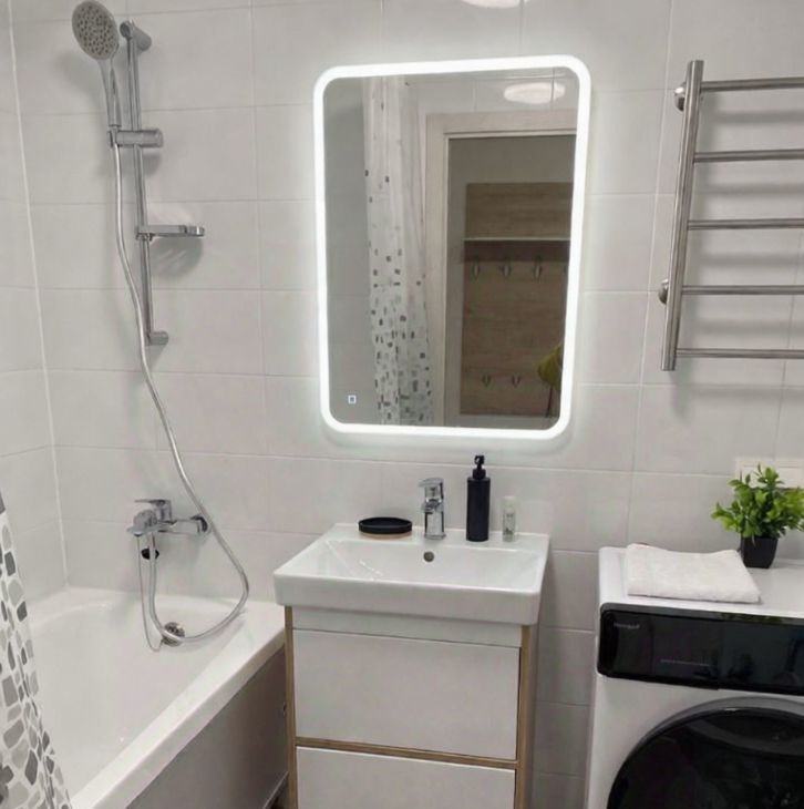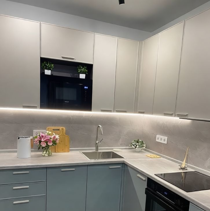 • Стиральная машина, смарт-TV, стильный холодильник, чайник, умное освещение, шкафы с топ-фурнитурой.