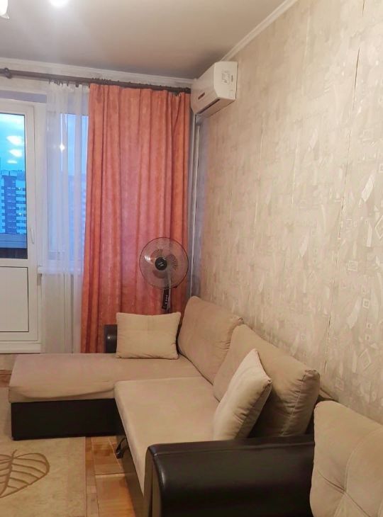 Гостиная: комфортный диван, просторный шкаф, лоджия.