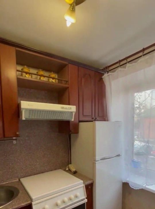Кухня: электрическая плита, стол, холодильник).