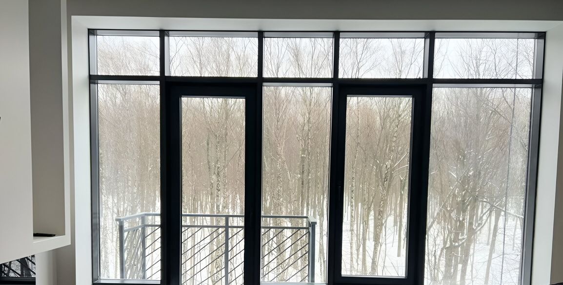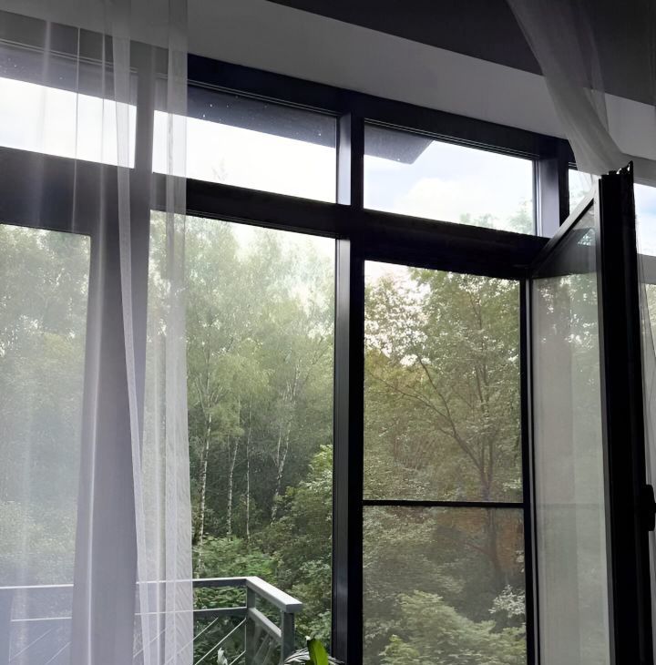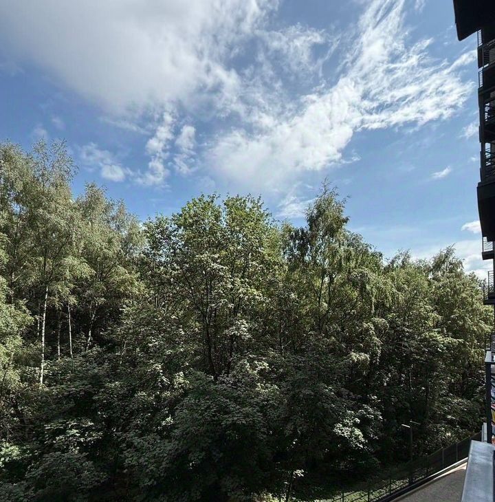 Из окон открывается изумительный вид на лес. Большие панорамные окна от стены до стены наполняют квартиру светом — чистый воздух и пение птиц.