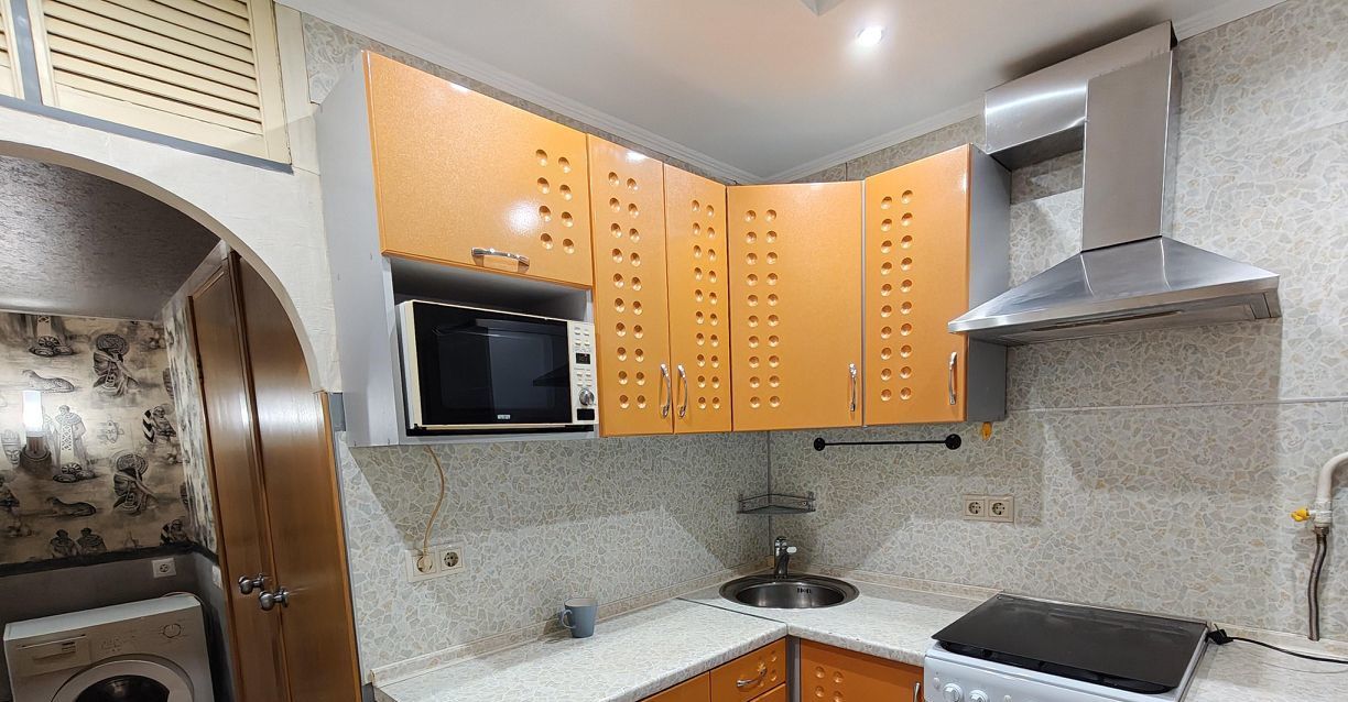 Кухня оборудована всем необходимым: есть холодильник, плита, микроволновая печь и стиральная машина. Обеденная зона оформлена в светлых тонах.
