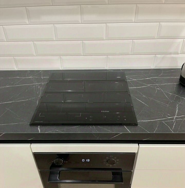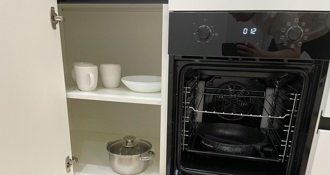 -угловой кухонный гарнитур со всторенной техникой: варочная панель, духовой шкаф, посудомоечная машина, вытяжка.