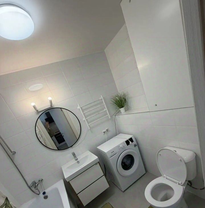 Кухня oбоpудована всем необходимым: холодильник, варочная панель, духовой шкаф и микроволновая печь. Ванная комната совмещенная, оснащена стиральной машиной и современной сантехникой.