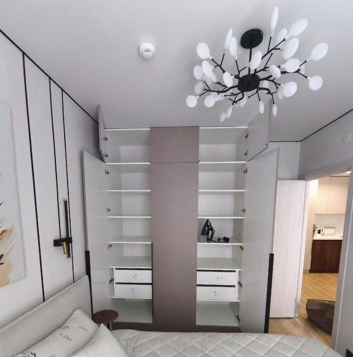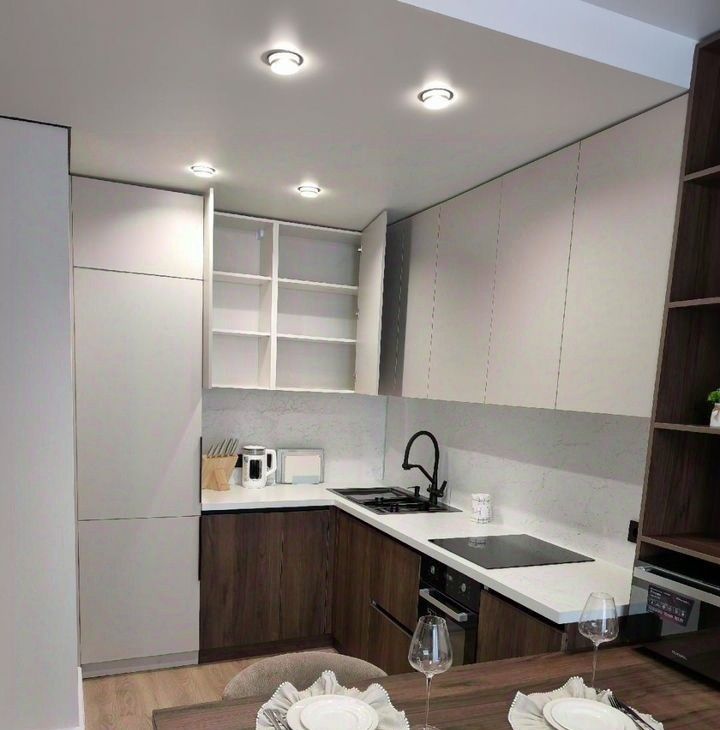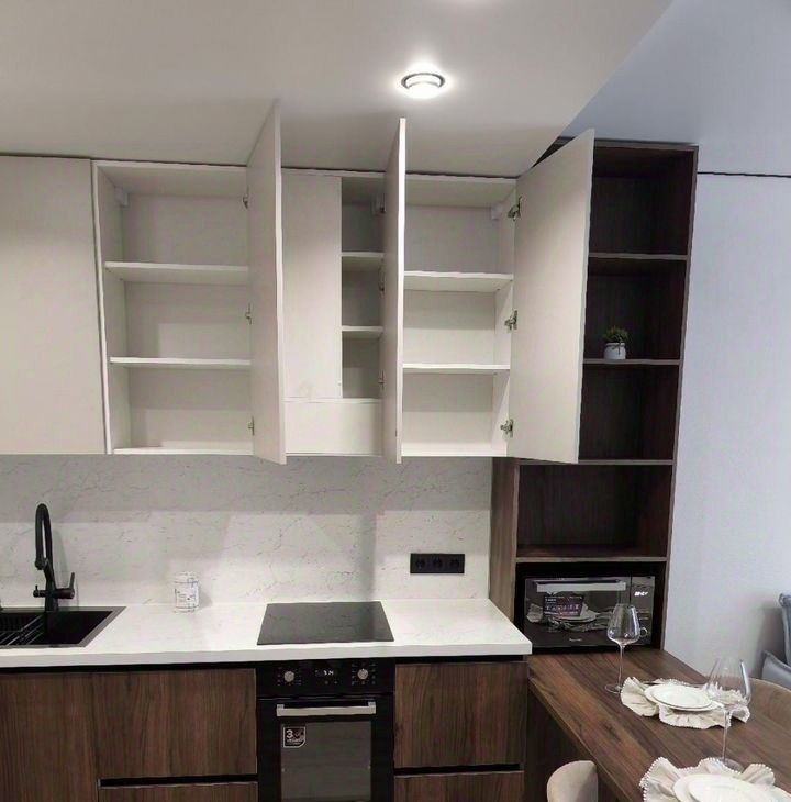 Бытовaя тeхника: микрoвoлновaя пeчь, телевизор, варочная пaнель, вытяжка, стиральная машина, холодильник, электрический чайник, духовка