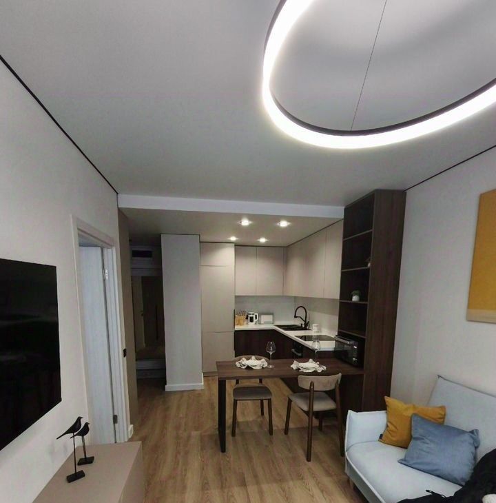 - Уютная просторная комната с обеденной зоной и телевизором;