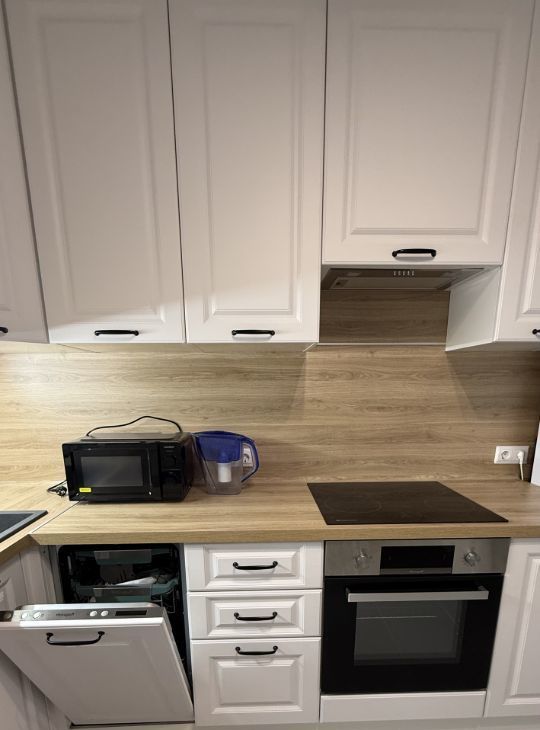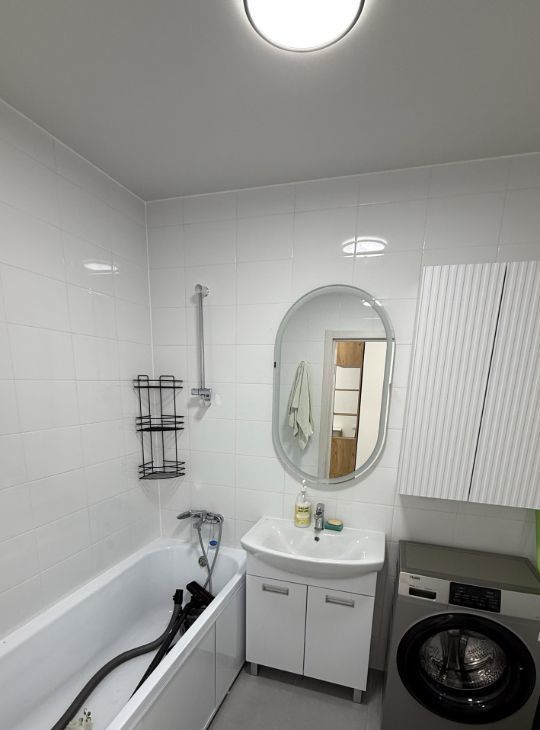 В квартире к есть все необходимое. Полностью меблированная. Техника тоже в наличии: холодильник, посудомоечная машина, микроволновая печь, телевизор и стиральная машина облегчат ваш быт. В ванной комнате установлена ванна.