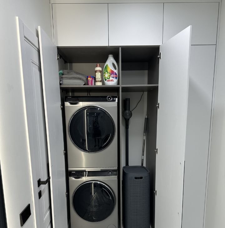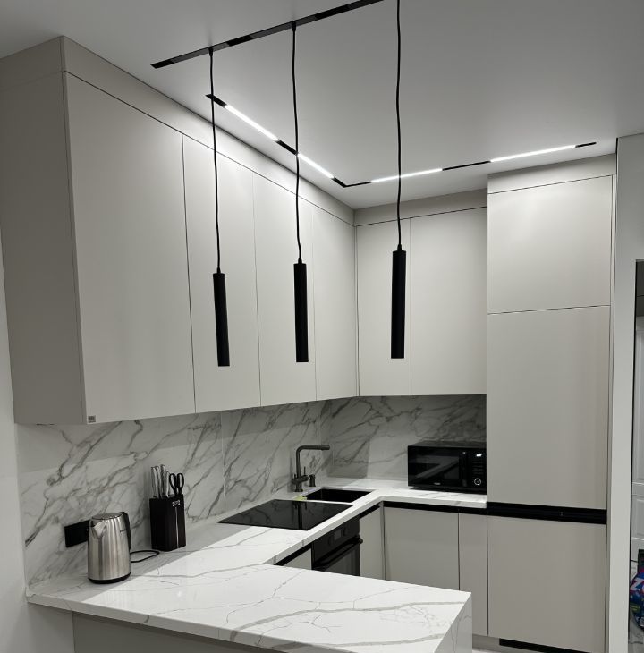 Материалы: Столешницы на кухне и в санузле выполнены из натурального кварца — это не только красиво, но и невероятно практично. Мебель изготовлена на заказ из дорогих и качественных материалов.