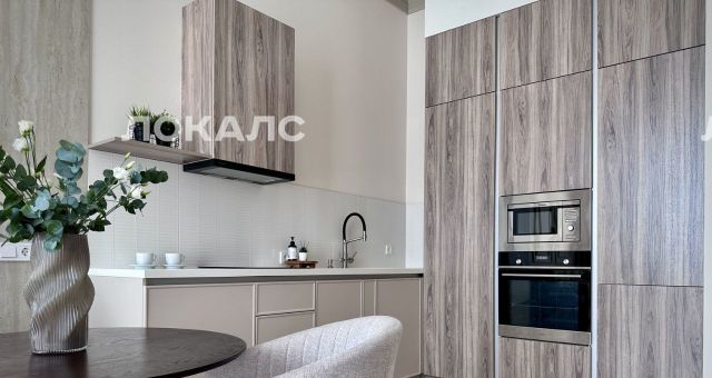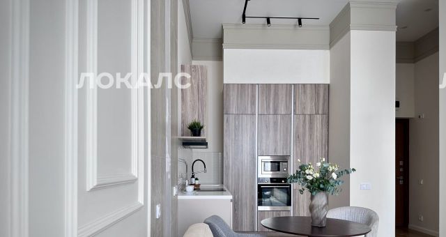 Общая площадь квартиры составляет 45 квадратных метров, из которых 20 квадратных метров занимает кухня. Высокие потолки в 3.8 метра дарят ощущение простора, квартира будто наполнена светом.