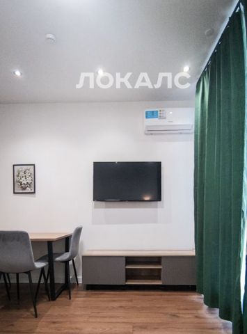— качественная мебель: удобная кухня, вместительный шкаф в спальне, обеденная зона, кровать с ортопедическим матрасом, раскладываемый двухметровый диван напротив подвесного телевизора, прихожая с большим зеркалом;