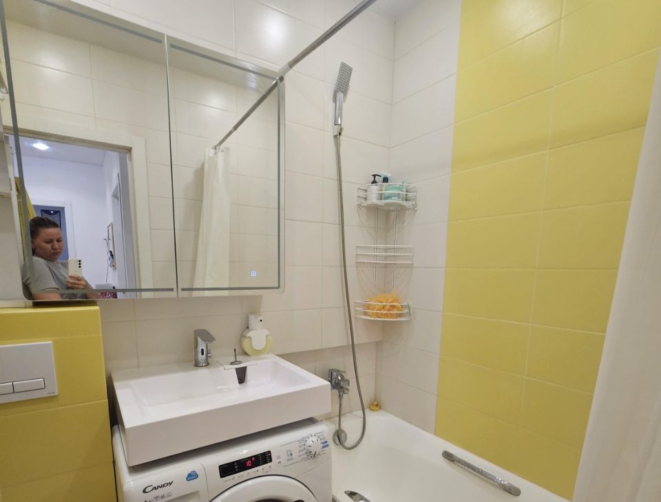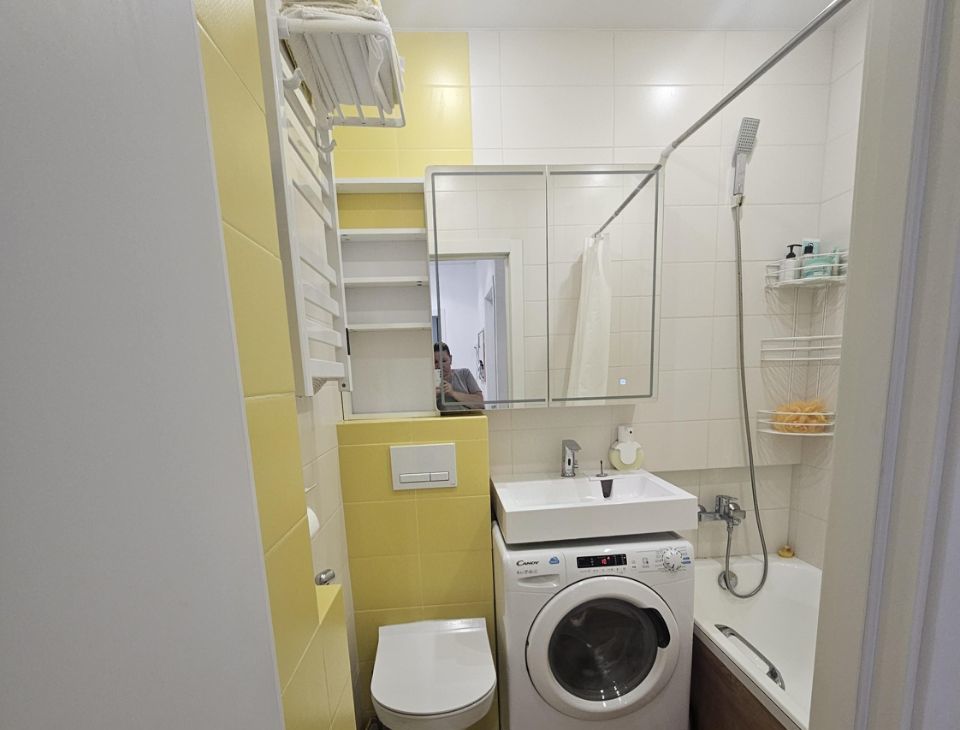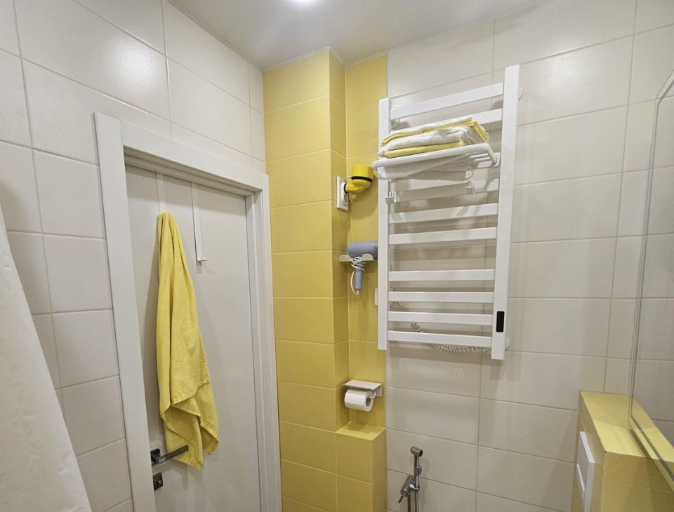 В ванной электрический полотенцесушитель, зеркало с подсветкой, гигиенический душ, стиральная машинка с сушкой.
