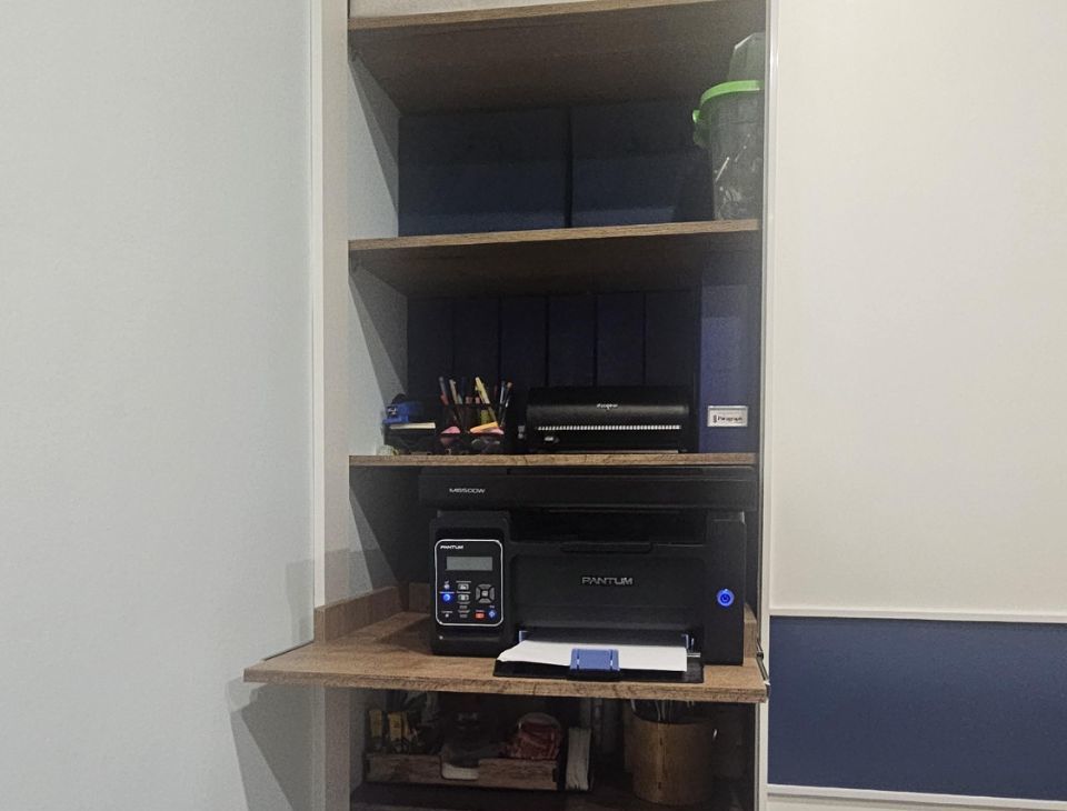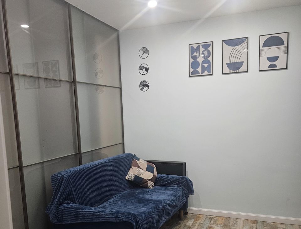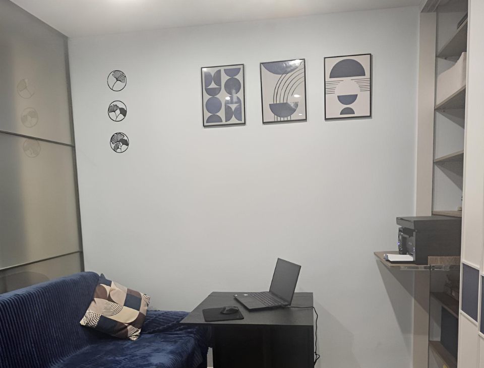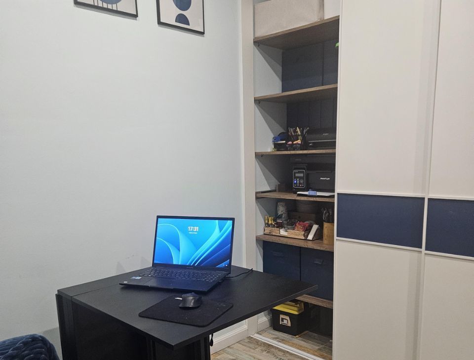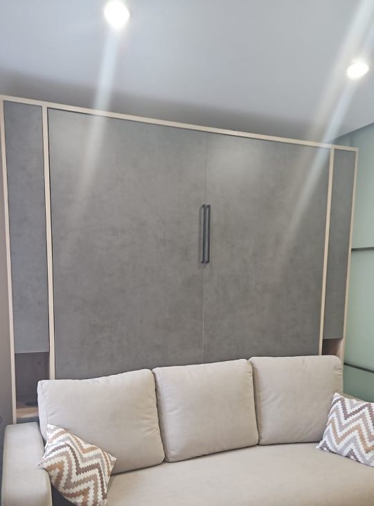 Гостиная разделена на 2 зоны. Шкаф-купе трансформируется в кабинет (см. фото), складной стол обеспечивает свободное место при необходимости. Есть дополнительное спальное место - диван для гостей.