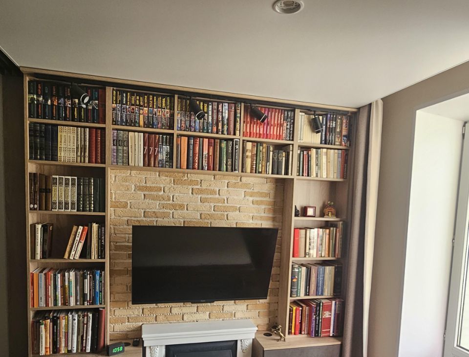 Спальня отделяется перегородкой, стоит также на подиуме. Есть электрокамин, создает уют. Библиотека.