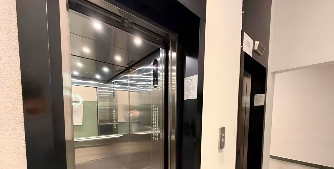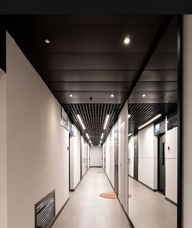 Входная группа оборудована колясочной, каворкингом, переговорной комнатой и гостевым санузлом.