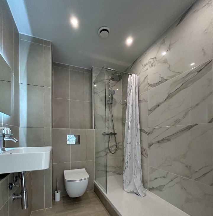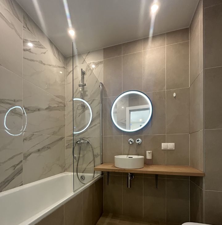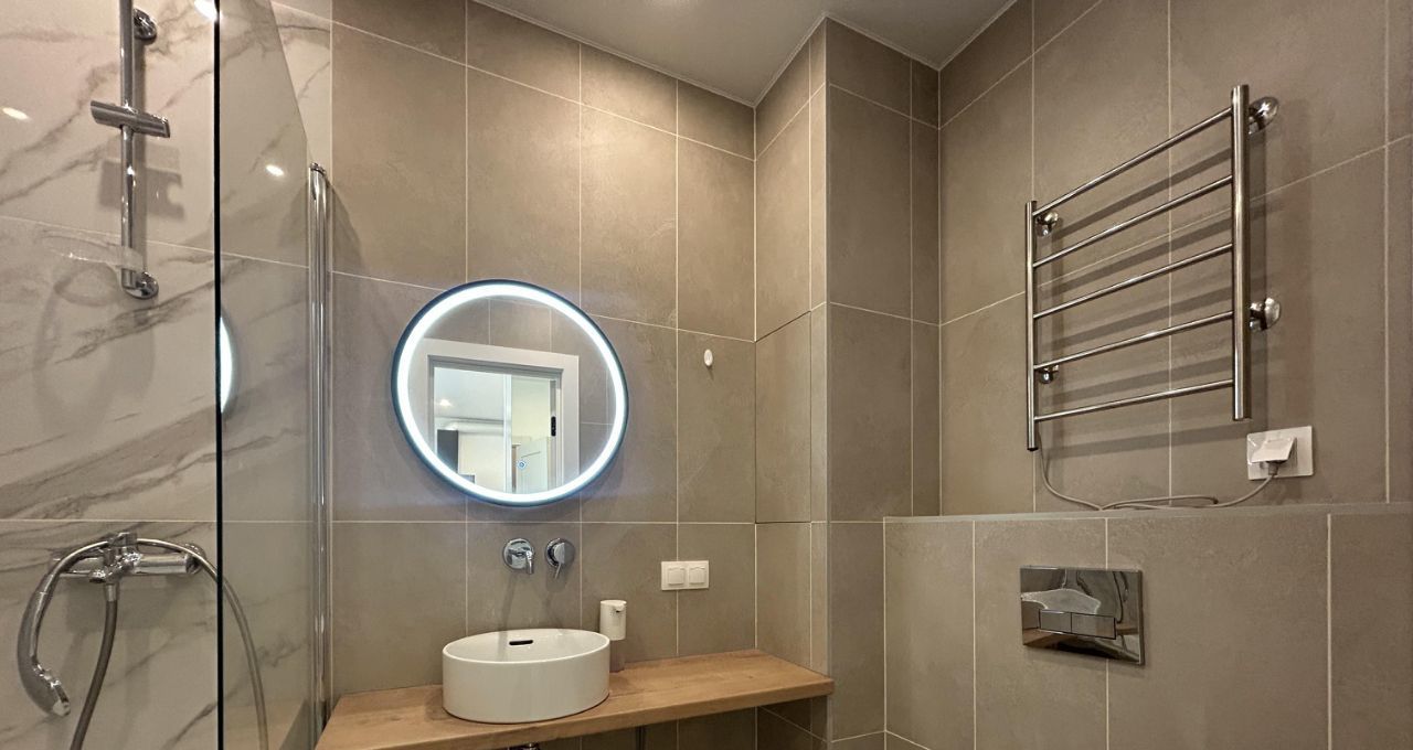 Планировка: две изолированные комнаты, просторная кухня-гостиная, два санузла с душевой и ванной (один санузел в спальне)