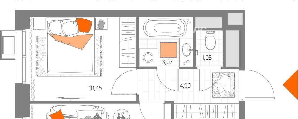 Общая площадь составляет 36.8 кв. м, жилая — 20 кв. м, кухня — 10 кв. м. Квартира расположена на 16 этаже 28-этажного дома, поэтому открывается прекрасный вид на город. Всего в доме один пассажирский и два грузовых лифта, что существенно облегчает перемещение.