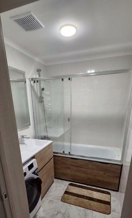 сдается просторная квартира на длительный срок.В квартире выполнен евро ремонт, установлена современная сантехника, стиральная машинка, укомплектована всей необходимой мебелью (спальня, гостиная, прихожая) Кухня со встроенной мебелью и техникой, площадью 10 м². В квартире абсолютно все новое.