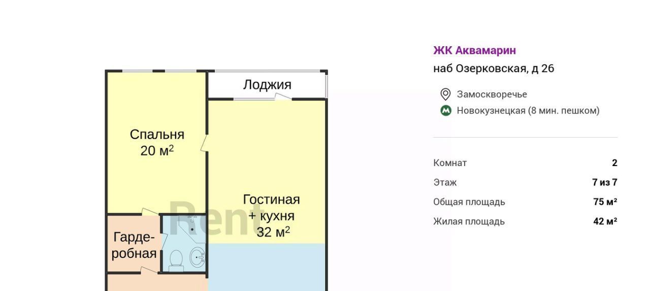 Предлагается 2-комнатная квартира общей площадью 75 м² в ЖК "Аквамарин" недалеко от станции метро "Новокузнецкая". Для комфортного проживания в наличии имеется вся необходимая мебель, а также нагреватель воды и система теплого пола. Кухонный гарнитур оснащен посудомоечной машиной, духовой печью. Для удобства организованы гардеробная комната и прачечная. Из дополнительных преимуществ - наличие лоджии. Окна обращены во двор, обеспечивая тишину.