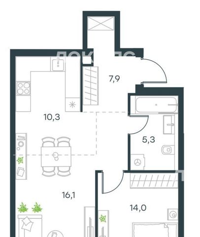 Продается квартира в ЖК LEVEL Мичуринский. Общая площадь квартиры составляет 53,2 кв. м, кухня — 10,3 кв. м.