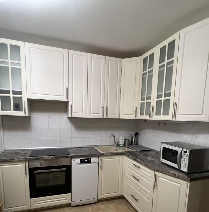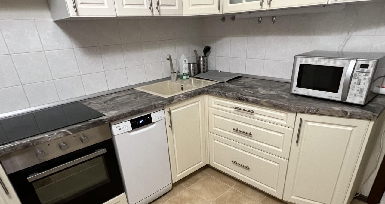 Кухня просторная, площадью 14 м², оснащена современной техникой, включая холодильник ,микроволновую печь, духовой шкаф и посудомоечную машину.
