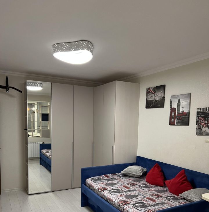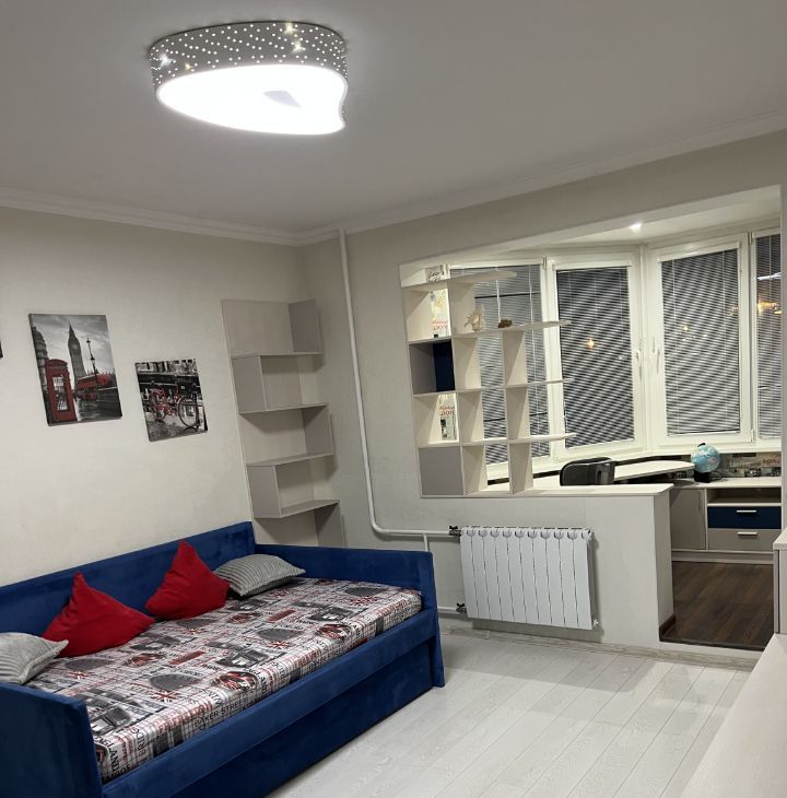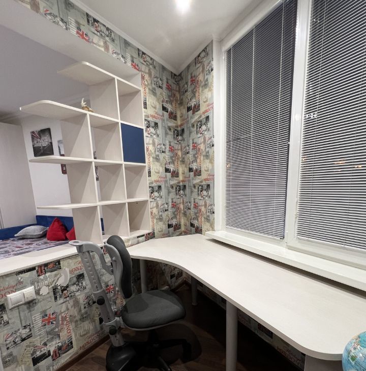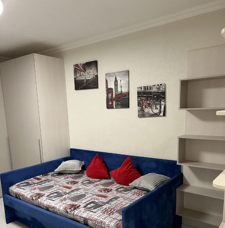 В одной комнате удобная кровать 140*200 с ортопедическим матрасом, и дополнительным выдвигающимся спальным местом, тумба ТВ с телевизором , а также имеется рабочий уголок с письменным столом и креслом.