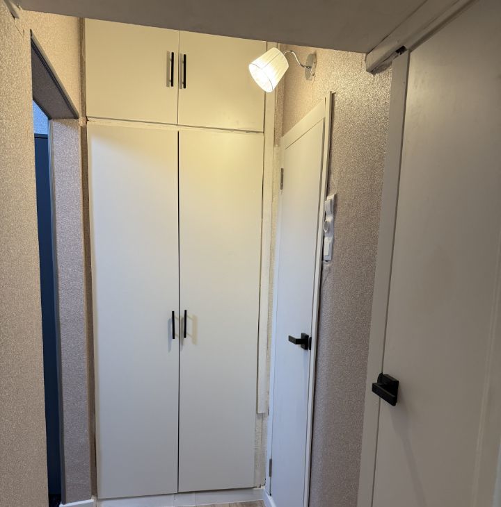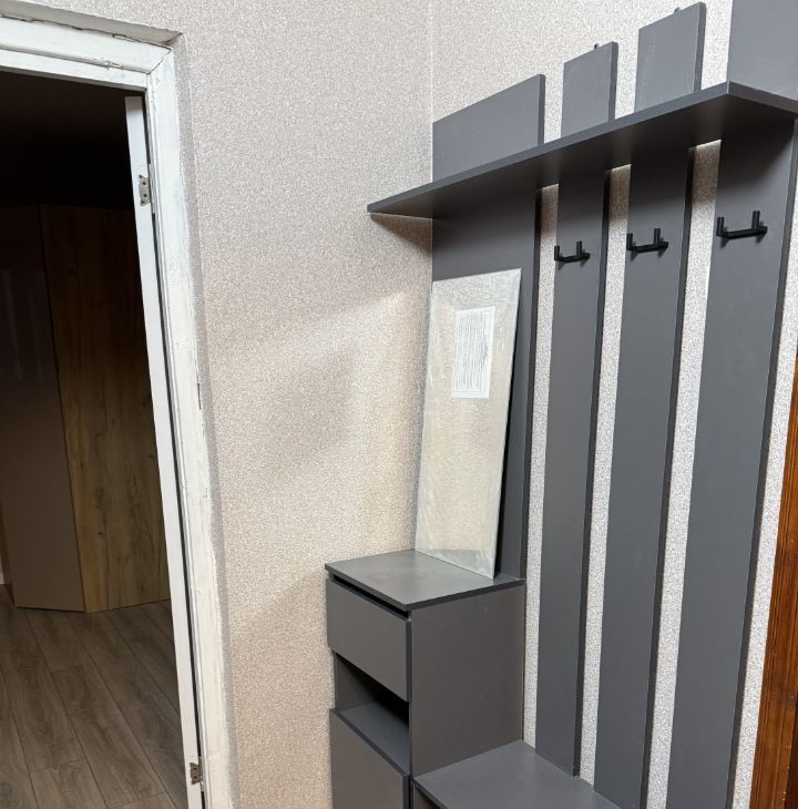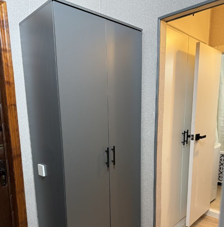 Балкон застеклен, что добавляет дополнительное пространство для отдыха. В прихожей установлен вместительный шкаф для верхней одежды.