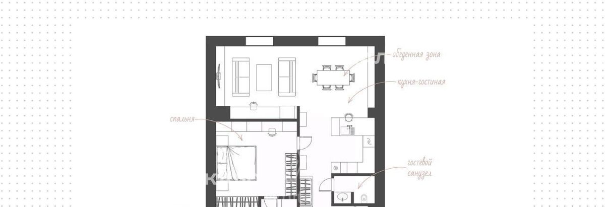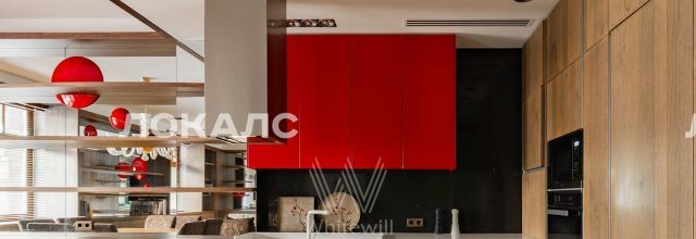 Спланирована кухня-гостиная с обеденной зоной, мастер-спальня с собственной ванной комнатой, гостевой санузел, прихожая. Квартира полностью меблирована, кухня от итальянской фабрики Snaidero оборудована бытовой техникой Miele, включая винный шкаф. Спальня оснащена матрасом Grether&Wells, в санузлах установлена сантехника Grohe. Возможна аренда машино-места в подземном паркинге за дополнительную плату.