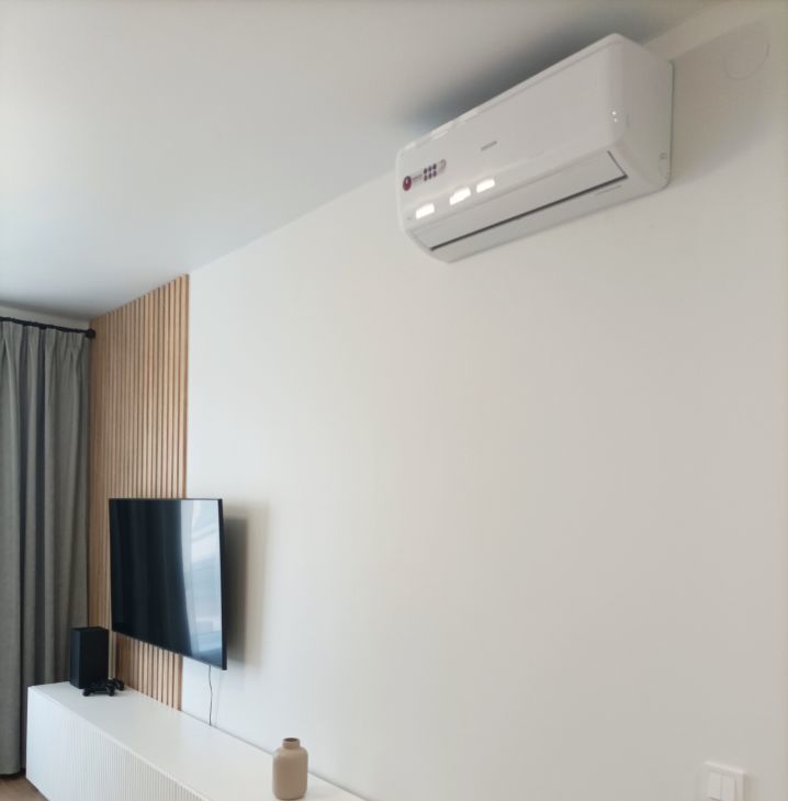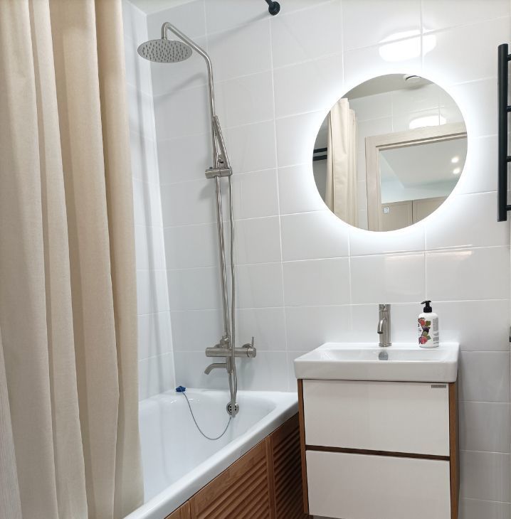Просторная кухня-гостиная оборудована всей необходимой мебелью и техникой: здесь есть встроенный кухонный гарнитур, холодильник, посудомоечная машина, двуспальный диван, большой комод практически на ширину стены, смартТВ. Кондиционер обеспечит приятный микроклимат в любое время года.