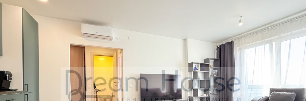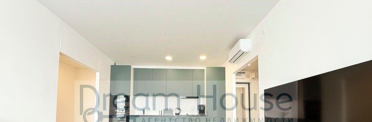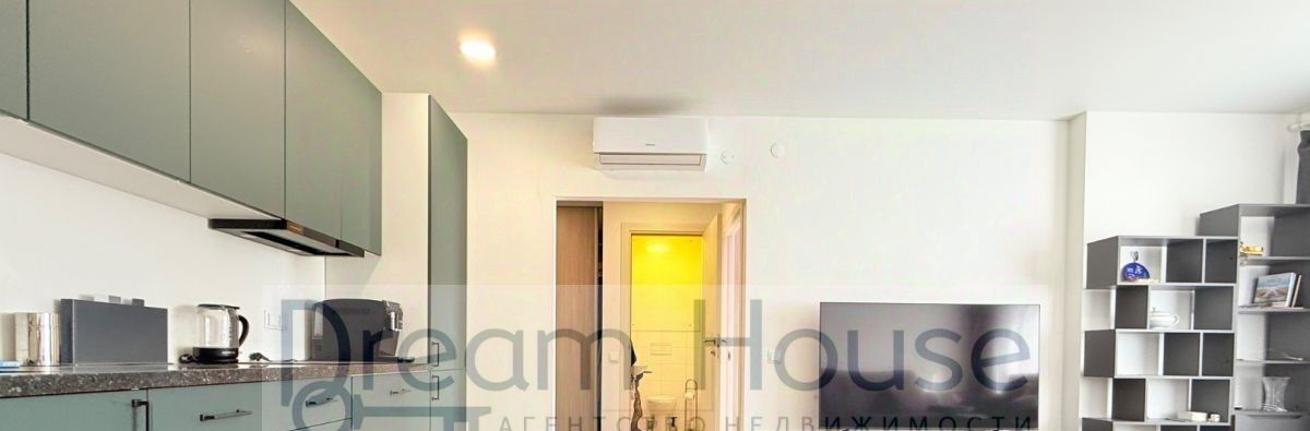 современный кухонный гарнитур ( варочная панель, посудомоечная машина, духовой шкаф, встроенный холодильник, кофемашина, вытяжка, кондиционер.) обеденный стол и стулья на четыре персоны, двуспальный раскладной диван в зоне гостиной, тумба-стенка и плазменный телевизор;