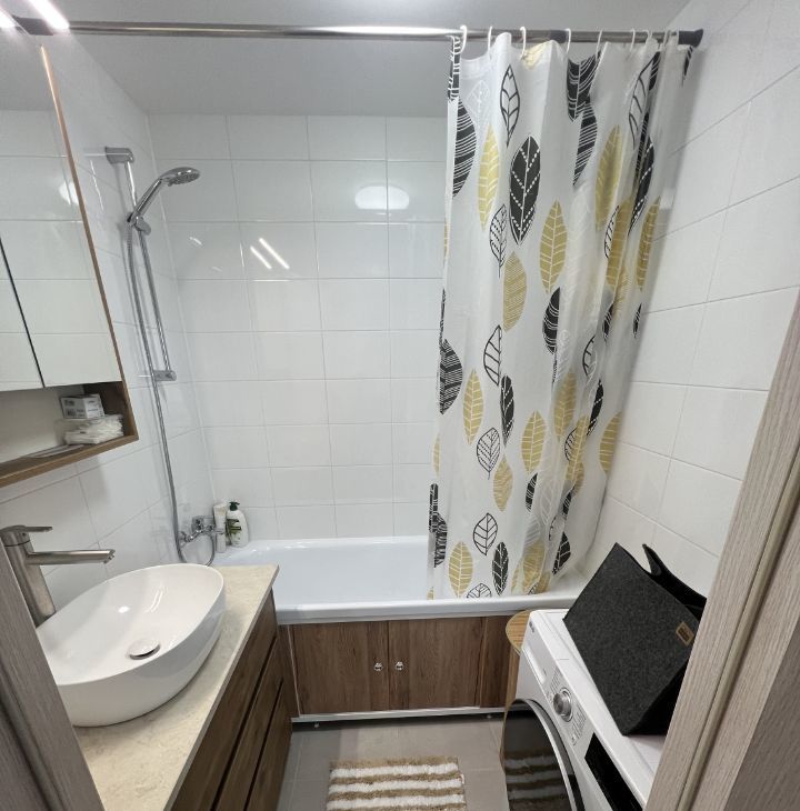 В ванной установлена стиральная машина с функцией сушки. В туалете инсталляция.
