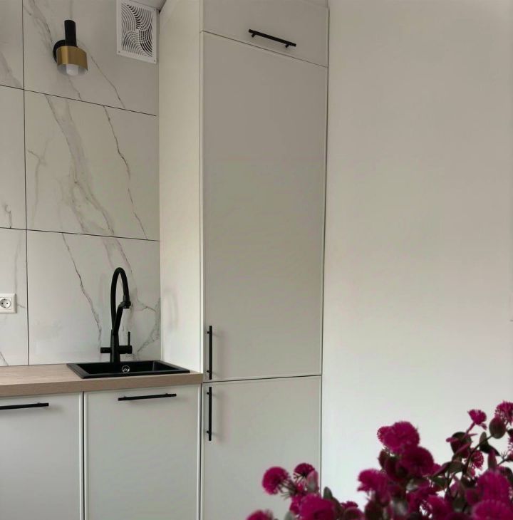 В квартире есть вся необходимая техника: варочная панель, духовой шкаф, холодильник с морозильной камерой, кондиционер, стиральная машинка с функцией сушки.