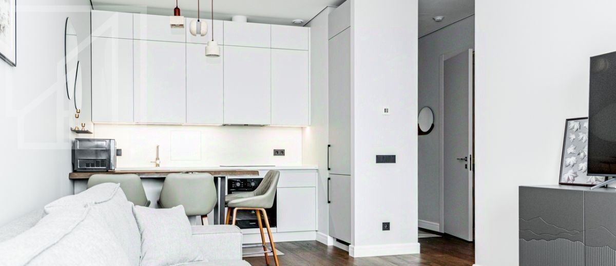 Планировка: кухня-гостиная с обеденной зоной, спальня, ванная комната, прихожая. Высокие потолки 3,1м. Выполнен дизайнерский ремонт в современном стиле, интерьер оформлен в лаконичных светлых тонах. Благодаря панорамным окнам пространство наполнено естественным светом. Апартаменты полностью меблированы и оснащены всей необходимой бытовой техникой. Из окон открывается вид на город в сторону делового центра "Москва-Сити".