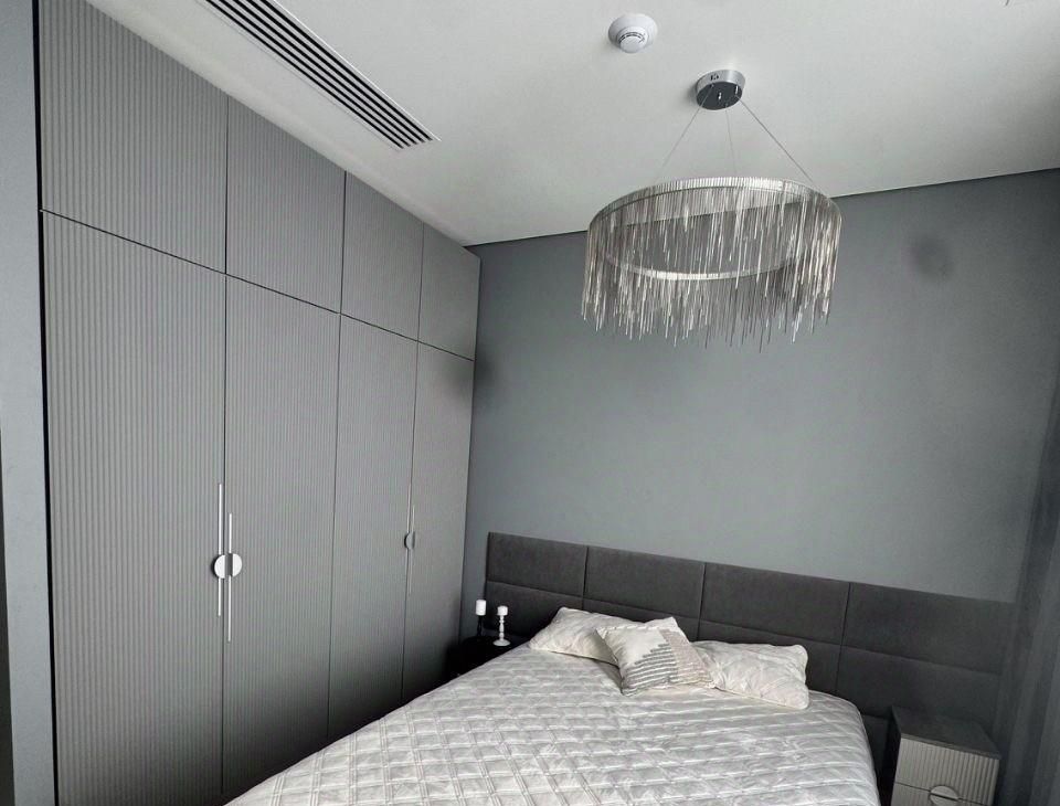 - Уютная спальня с большим окном и гардеробной зоной.