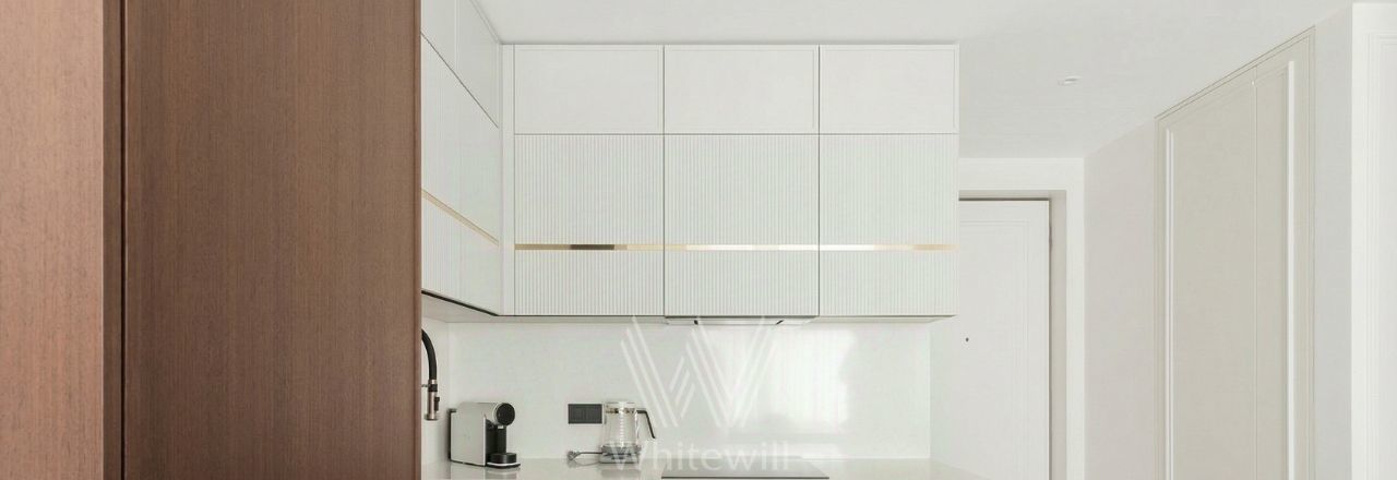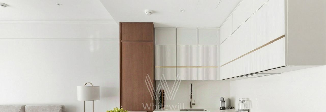 Спланирована кухня-гостиная с обеденной зоной, спальня, санузел с душевой, прихожая. Апартаменты полностью меблированы и укомплектованы бытовой техникой премиального сегмента: на кухне установлены духовой шкаф с функцией СВС, индукционная варочная поверхность, встраиваемый холодильник, посудомоечная машина, вытяжка — вся техника Haier, а также двухсекционный винный холодильник Meyvel. В гардеробной зоне — стирально-сушильная машина Haier. На кухне — смеситель Omoikiri, в санузле — сантехника Dornbracht и душевые ограждения Huppe. Установлена капсульная кофемашина Bork, чайник Bork, а также техника для ухода за квартирой — пылесос Miele.