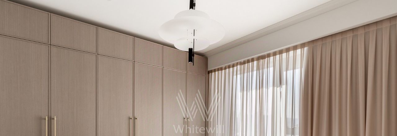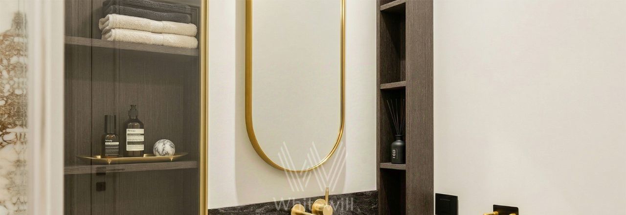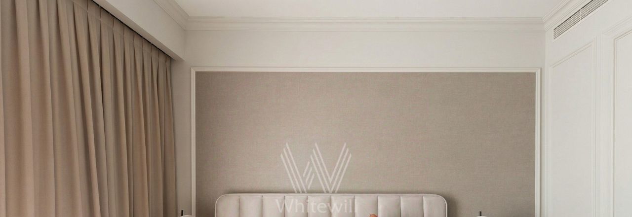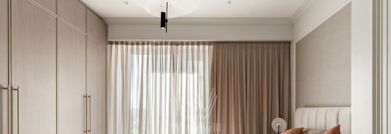 Апартаменты с 1 спальней общей площадью 58 м² в комплексе премиум-класса "Поклонная, 9" на 18 этаже. Выполнена дизайнерская отделка в современном стиле с использованием натуральных материалов. Вся мебель изготовлена на заказ: фасады на кухне и в ванной выполнены из шпона и латуни, барная стойка из кварцита и столешница из агломерата. Установлены мягкая мебель My Room, барные стулья Eichholtz, мраморный стол с деревянными элементами Garda Decor, шторы с электроприводом. Спальня оснащена мраморными светильниками Danton и итальянским двухсторонним матрасом.