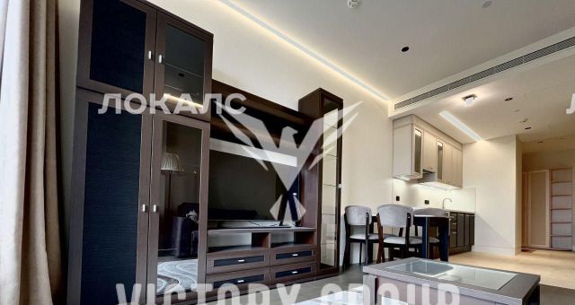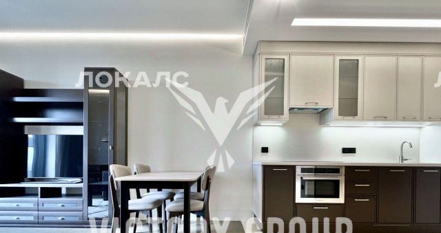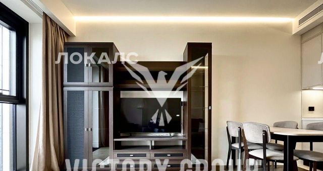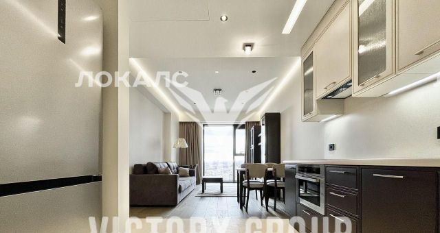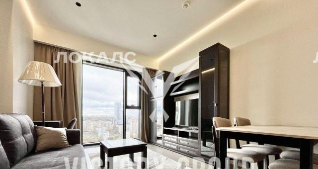 Площадь квартиры - 65 м. Здесь выполнен дизайнерский ремонт с применением высококачественных материалов, цветовая гамма - в тёплых постельных тонах. Панорамные окна наполняют пространство естественным светом и открывают живописные виды на город и Кутузовский проспект.