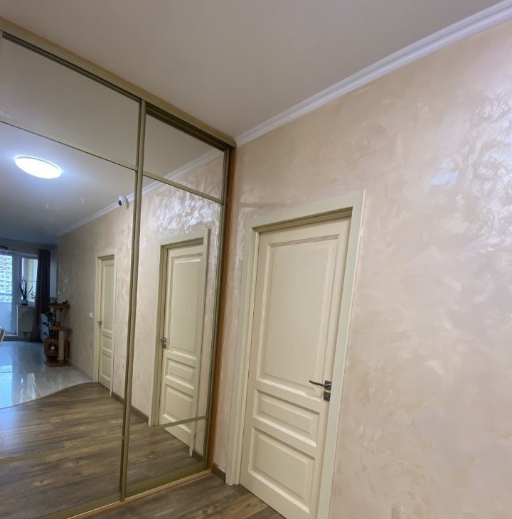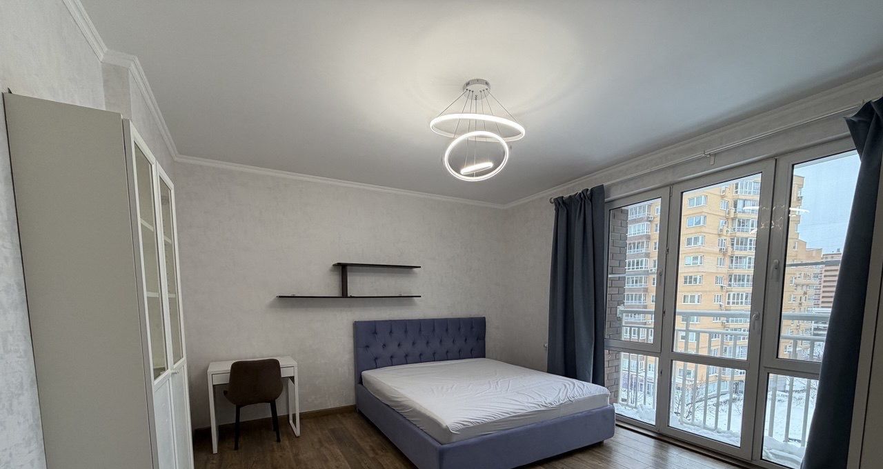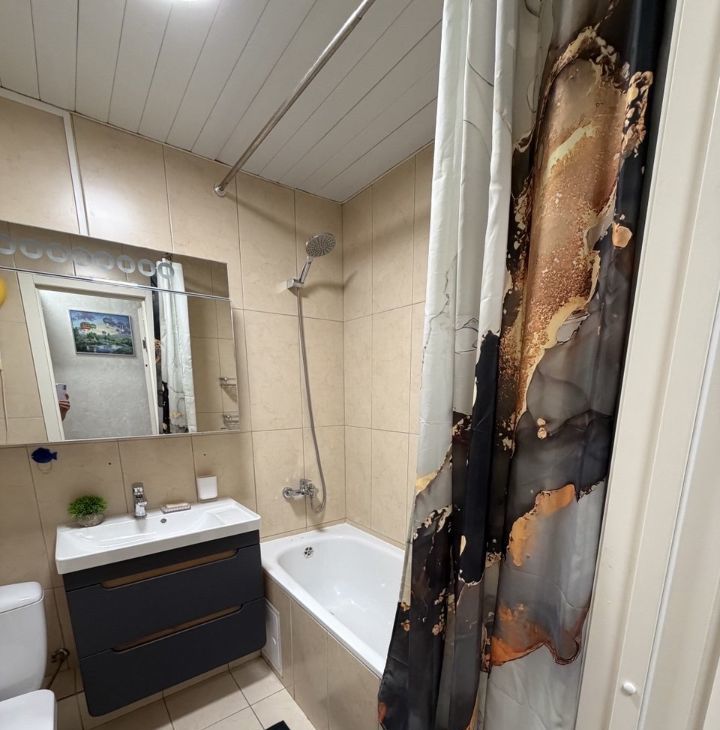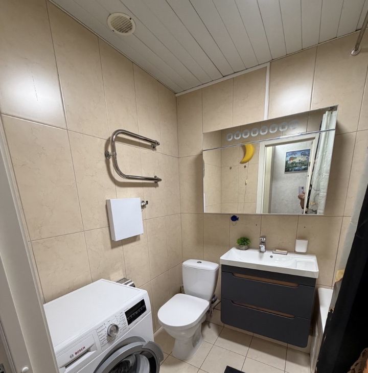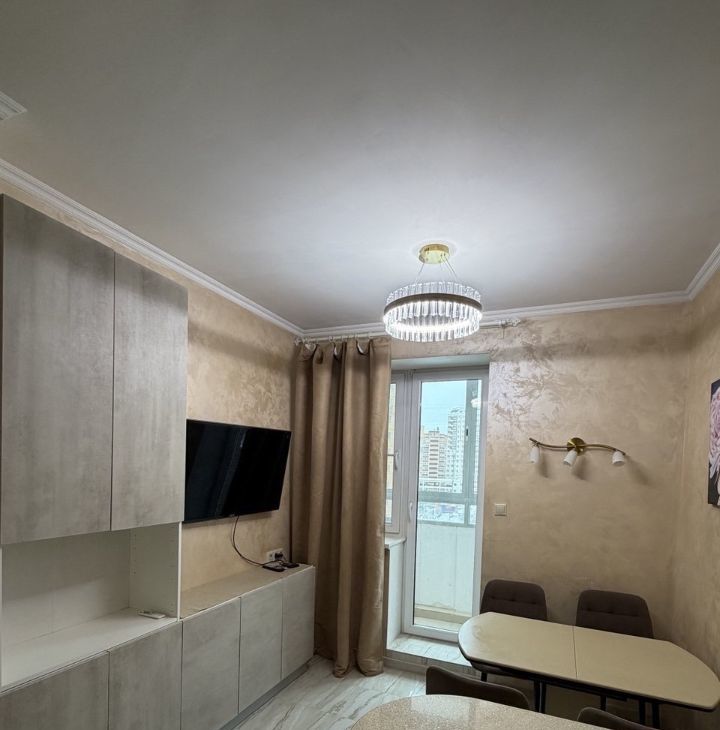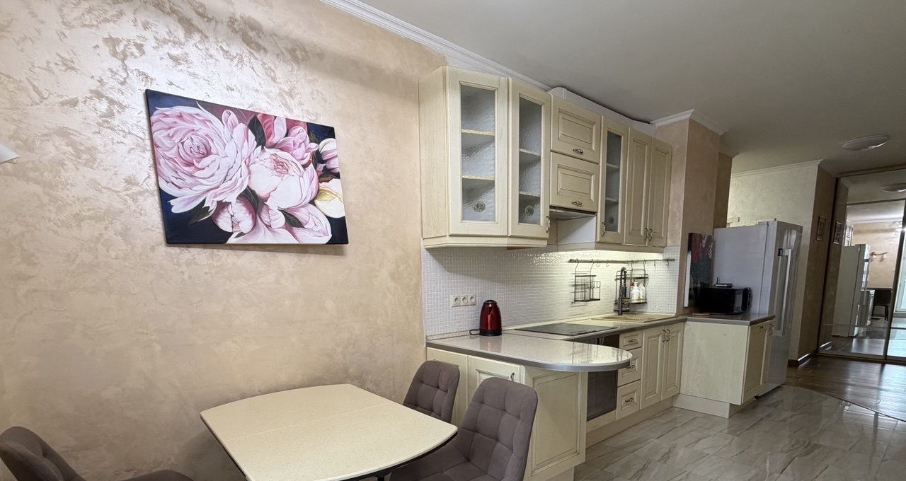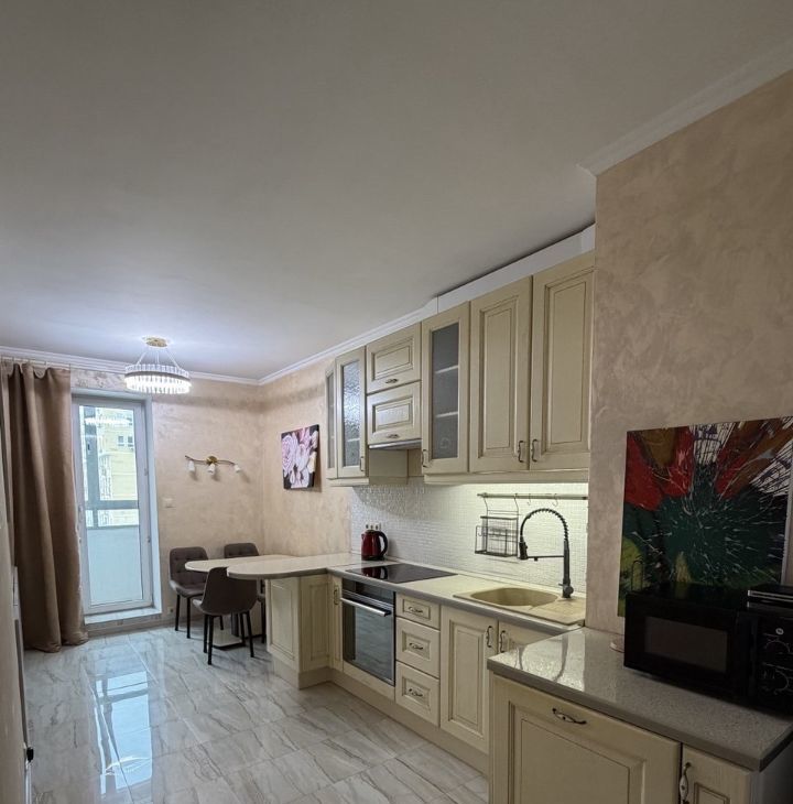 В квартире есть всё необходимое для комфортного проживания: современная мебель на кухне и в комнатах, техника — холодильник, посудомоечная машина, электрический духовой шкаф, электрическая варочная панель, телевизор, робот пылесос и стиральная машина. Планировка включает совмещённый и отдельный санузлы, а также балкон с видом на улицу. В ванной комнате установлена ванна.