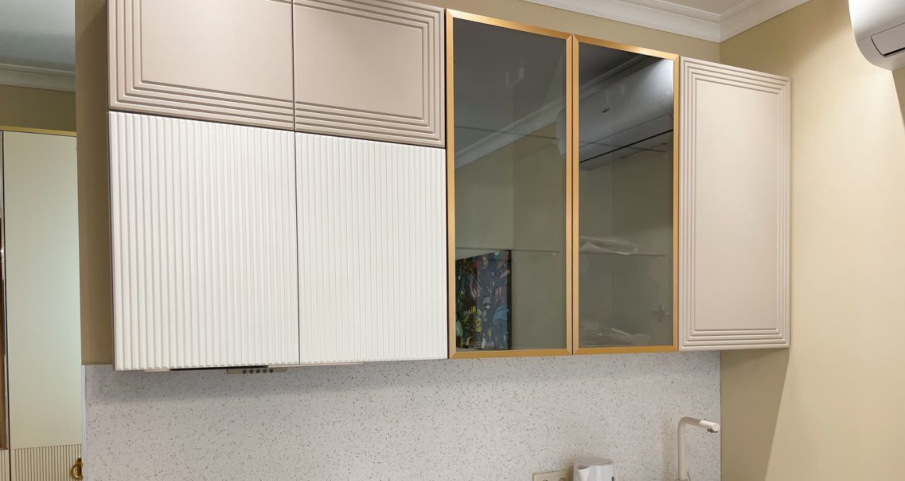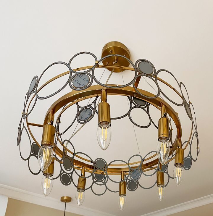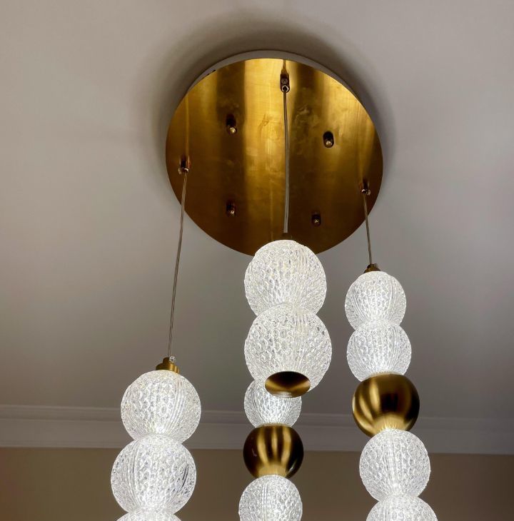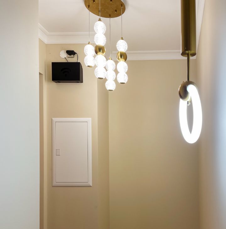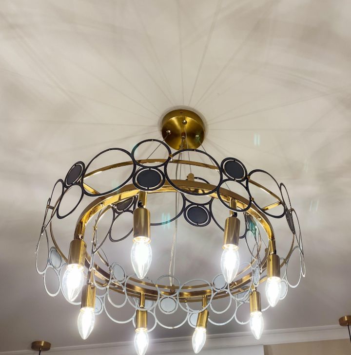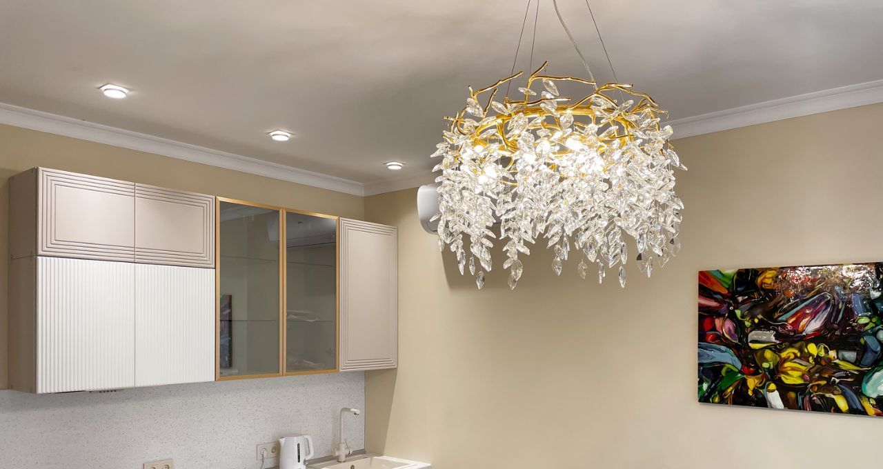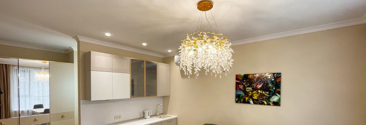 * Гостевая просторная комната совмещенная с кухней натяжные потолки с подсветкой и сверкающими дизайнерскими люстрами