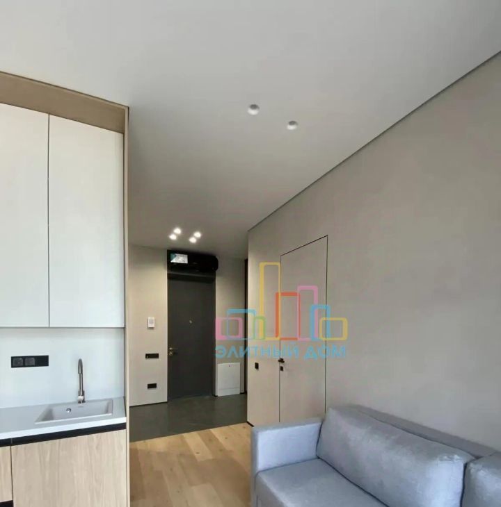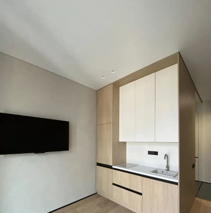 - Kуxня-гостиная с встроенной кухней и гостевой зоной с раскладным диваном.
