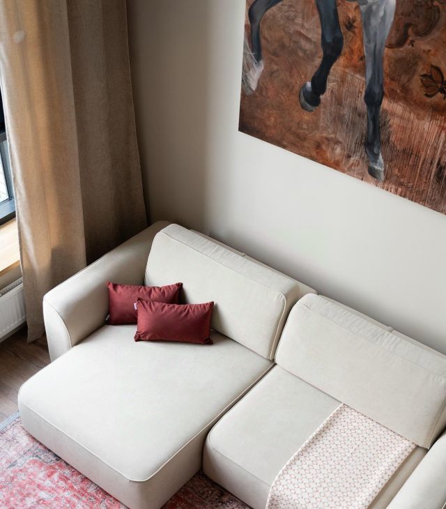 В квартире сделан дизайнерский ремонт, который подчеркивает стиль и комфорт. Полностью мебелированные комнаты и кухня содают атмосферу домашнего уюта. 2 спальных места - широкая двуспальная кровать в спальне с ортопедическим матрасом и раскладывающийся диван в гостиной, разные источники освещения, система кондиционирования, комфортный санузел с ванной, фэном, стиральной машиной, на кухне