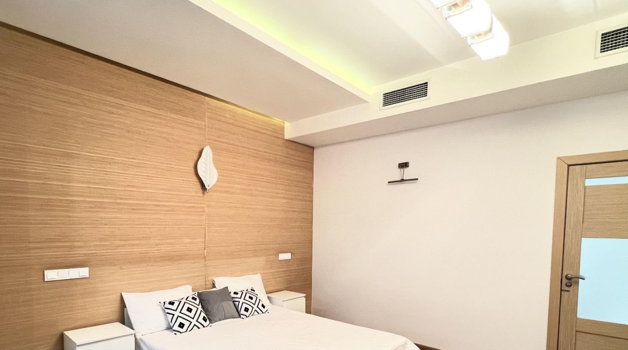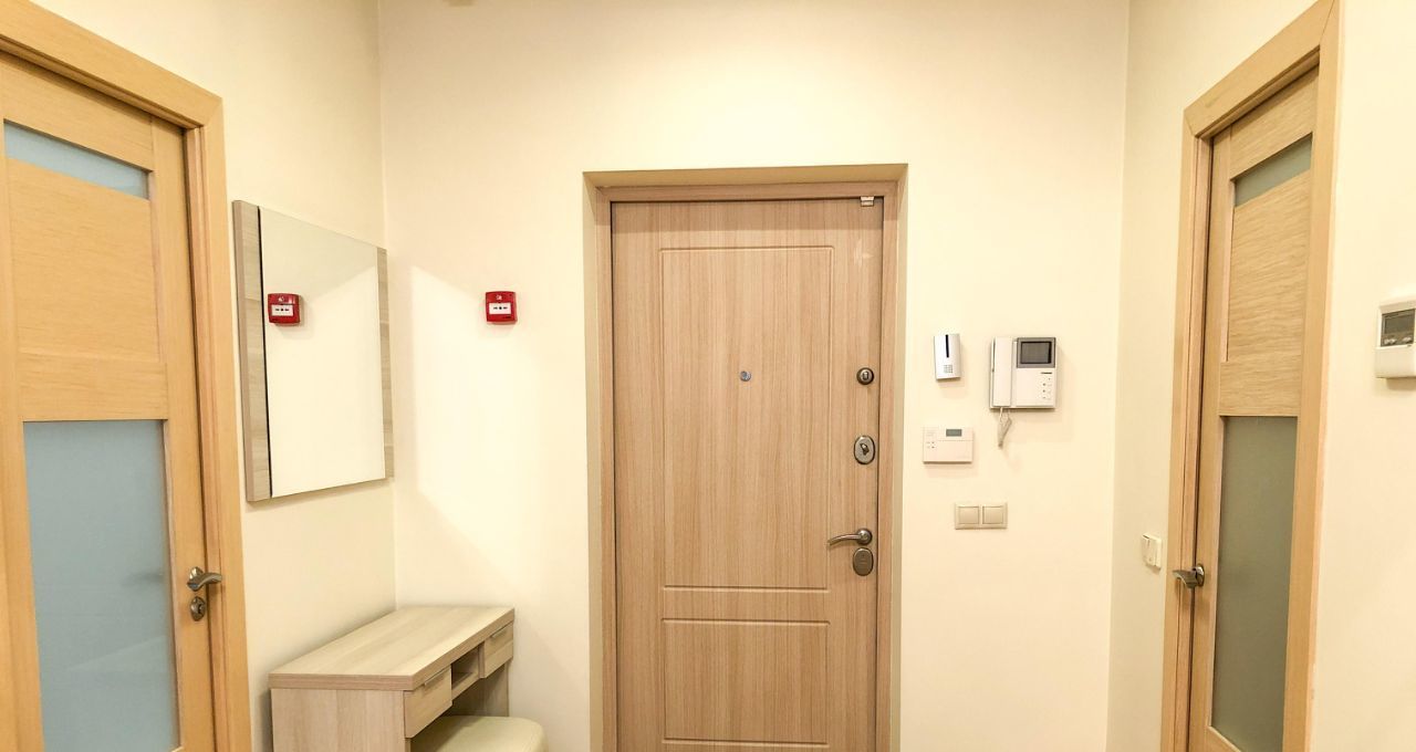 Квартира полностью укомплектована мебелью и техникой: духовой шкаф, варочная панель, микроволновка, телевизор, стиральная машина, холодильник. Установлены кондиционеры и система климат-контроля.