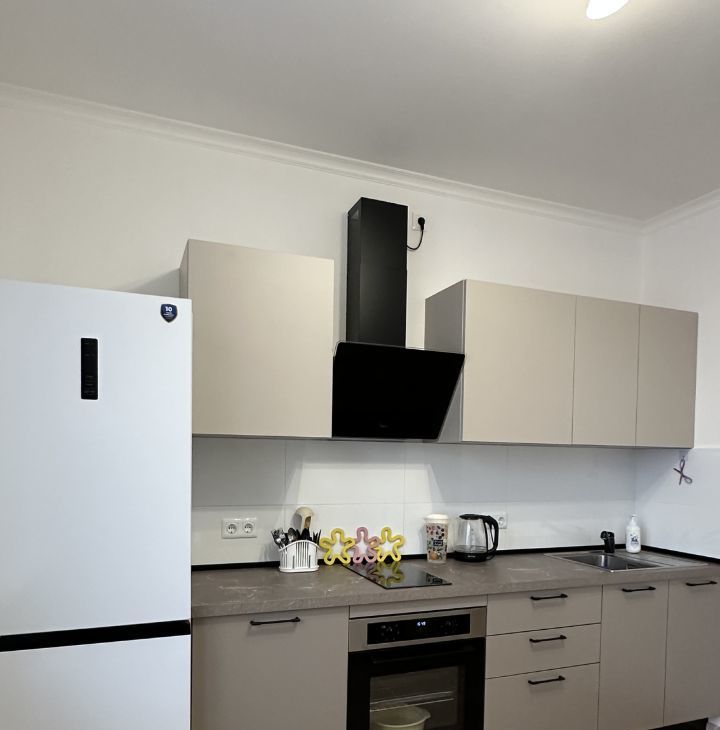 Кухонный гарнитур, холодильник, вытяжка, духовка, варочная панель, стол обеденный, стулья.