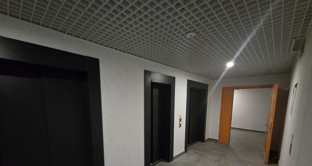 В доме три лифта, есть колясочная, широкий коридор.