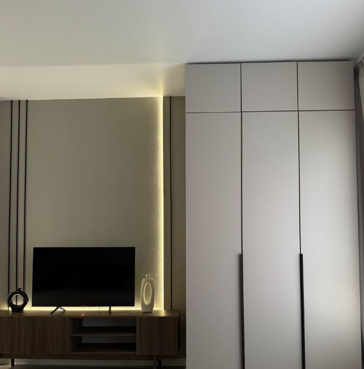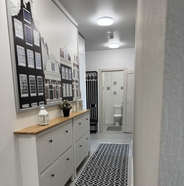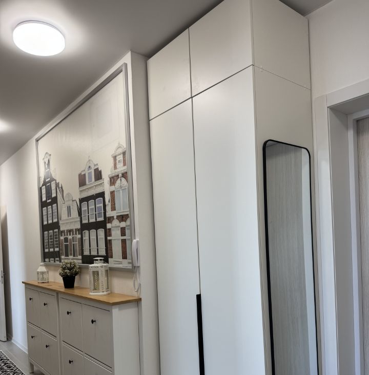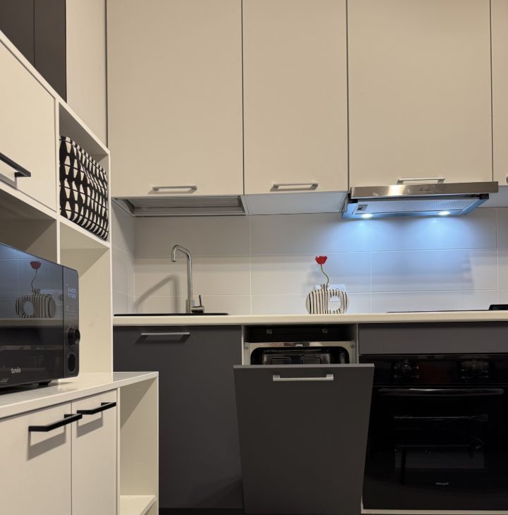 В квартире 2 кондиционера, 2 смарт телевизора, посудомоечная машина, духовой шкаф, микроволновая печь, плита, чайник, стиральная машина, качественный холодильник - всё новое. Продуманы все мелочи для комфортной жизни. 3 вместительных шкафа в потолок, 2 больших обувницы, косметический столик и уютный уголок с креслами для чтения.