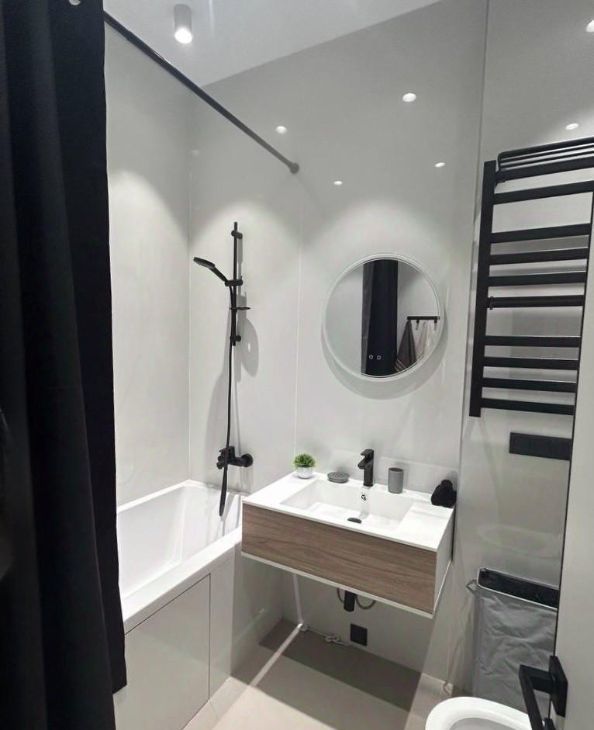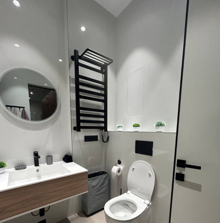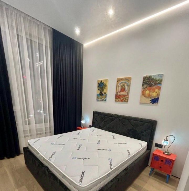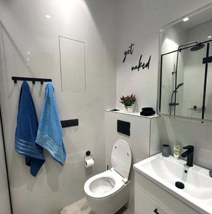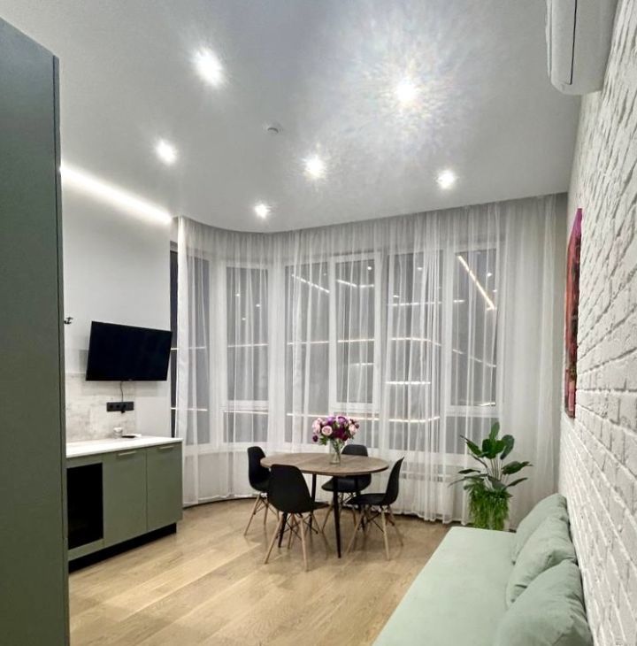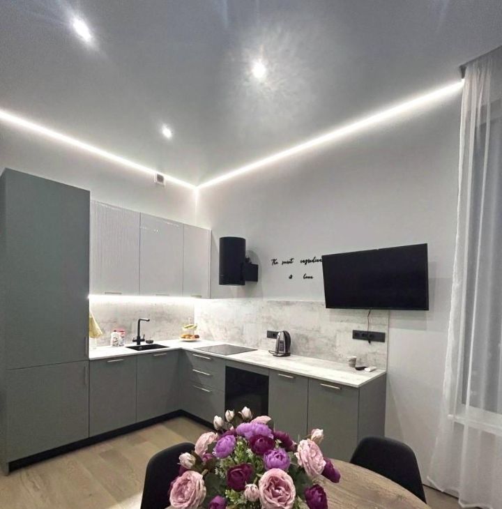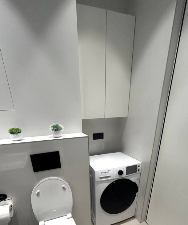 В квартире выполнен свежий ремонт, установлена современная мебель и техника: кондиционер, холодильник, посудомоечная машина, телевизор и стиральная машина.