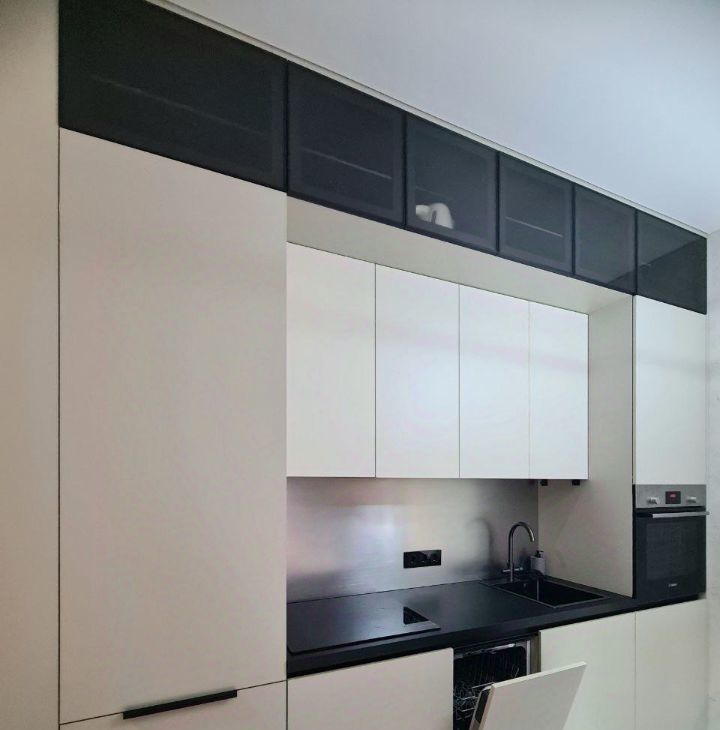 Кухня-гостиная: полный комплект техники (варочная панель, духовой шкаф, холодильник, посудомоечная машина), кухонный гарнитур, обеденная зона со столом и стульями.