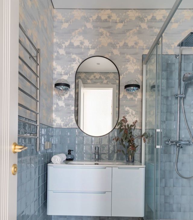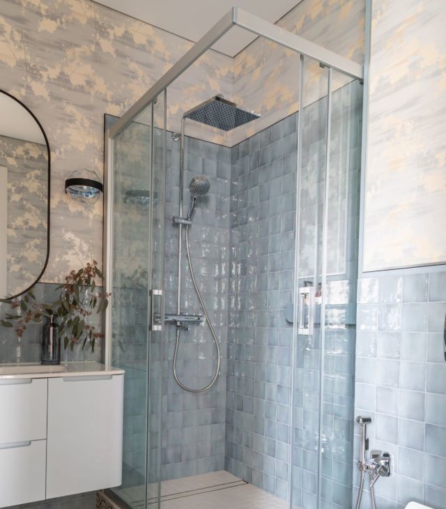 Сан. Узел. Душевая стойка c термостатом Jacob Delafon Atom, Мебель корпусная (шкаф над инсталляцией и тумба) , Шкаф под стиральную машину , Хозяйственный шкаф. Мозаика напольная