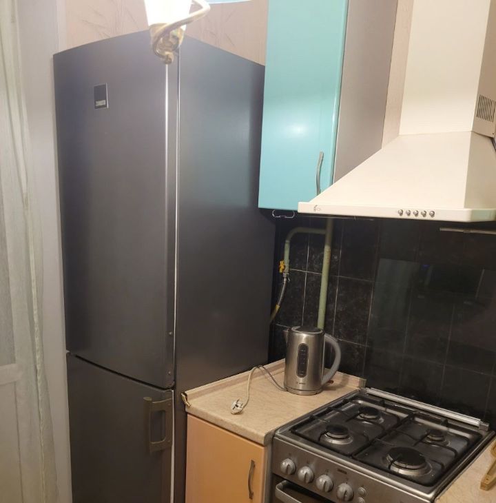 Кухня: Обеденный стол, полноценный гарнитур с мойкой и столешницей, холодильник, газовая плита, вытяжка, микроволновка, чайник, набор посуды.