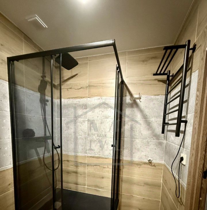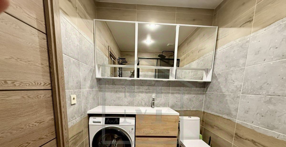 Санузел совмещенный, оснащен душевой кабиной и стиральной машиной.