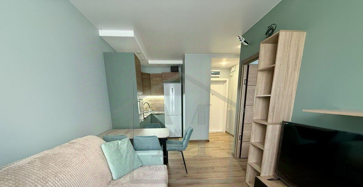 Кухня-гостиная оборудована необходимой техникой (холодильник, духовка/свч, варочная панель, вытяжка), в зоне гостиной раскладной диван.