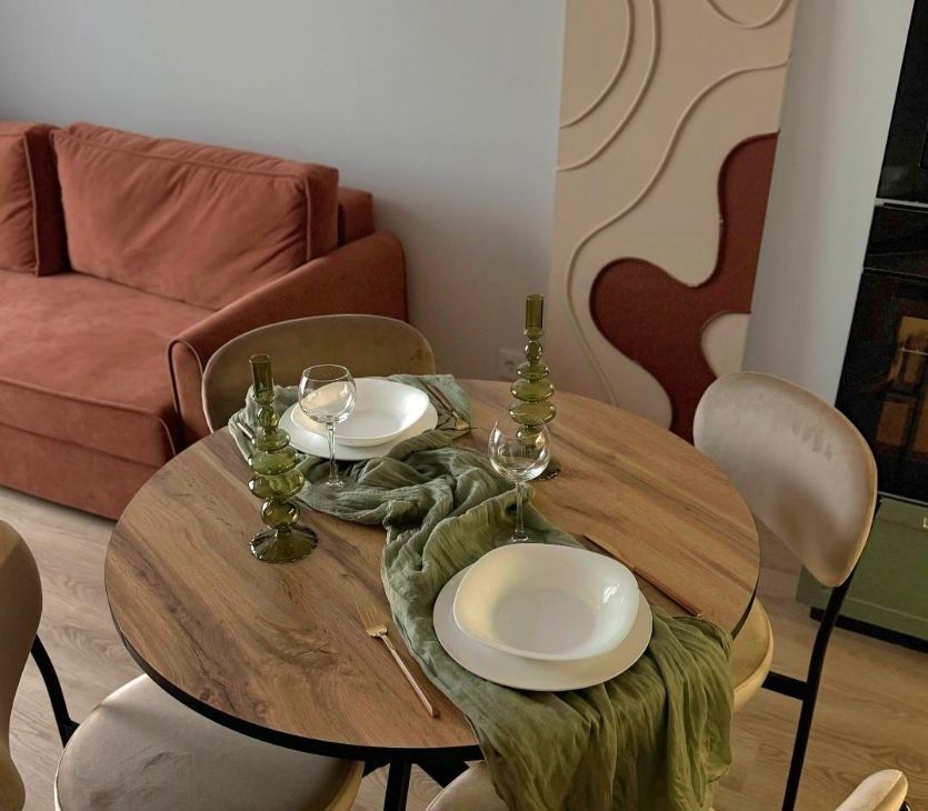 В гостиной имеется телевизор, стильный диван,а так же разные аксесуары для комфорта. Обеденная зона оборудована круглым столом и стульями. Кухня оснащена современной техникой: холодильник, плита, микроволновая печь, посудомоечная машина и стиральная машина.